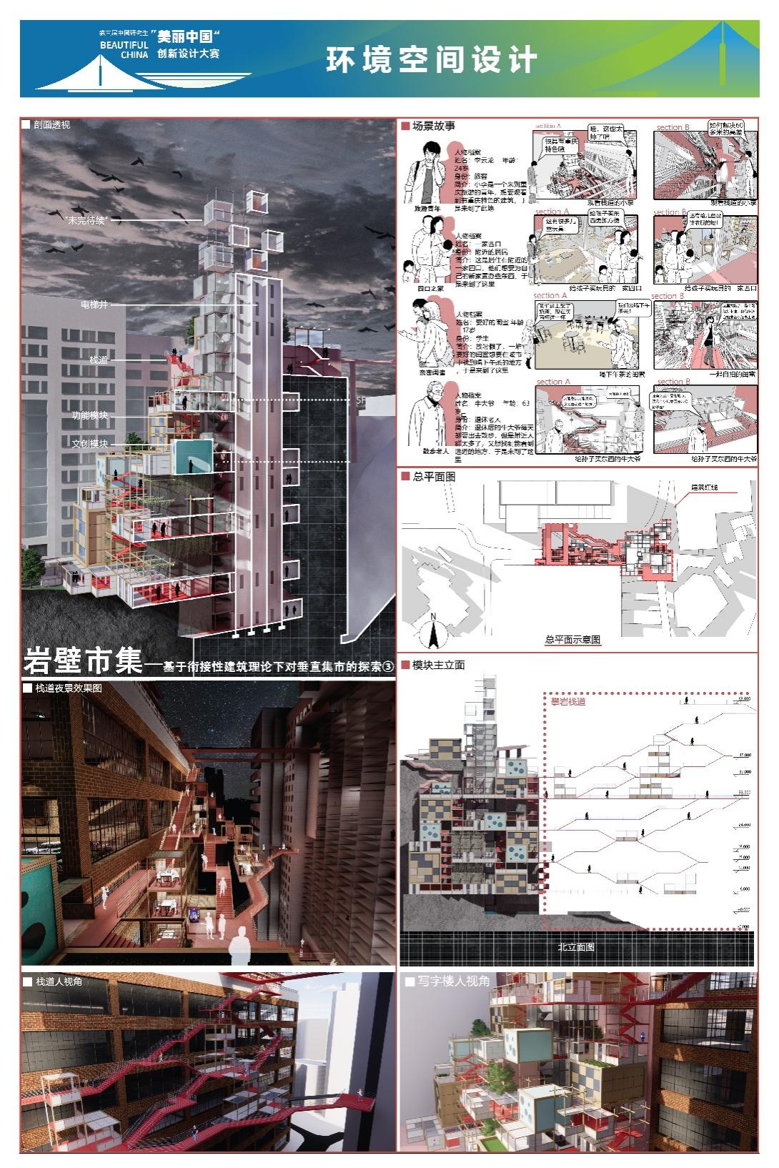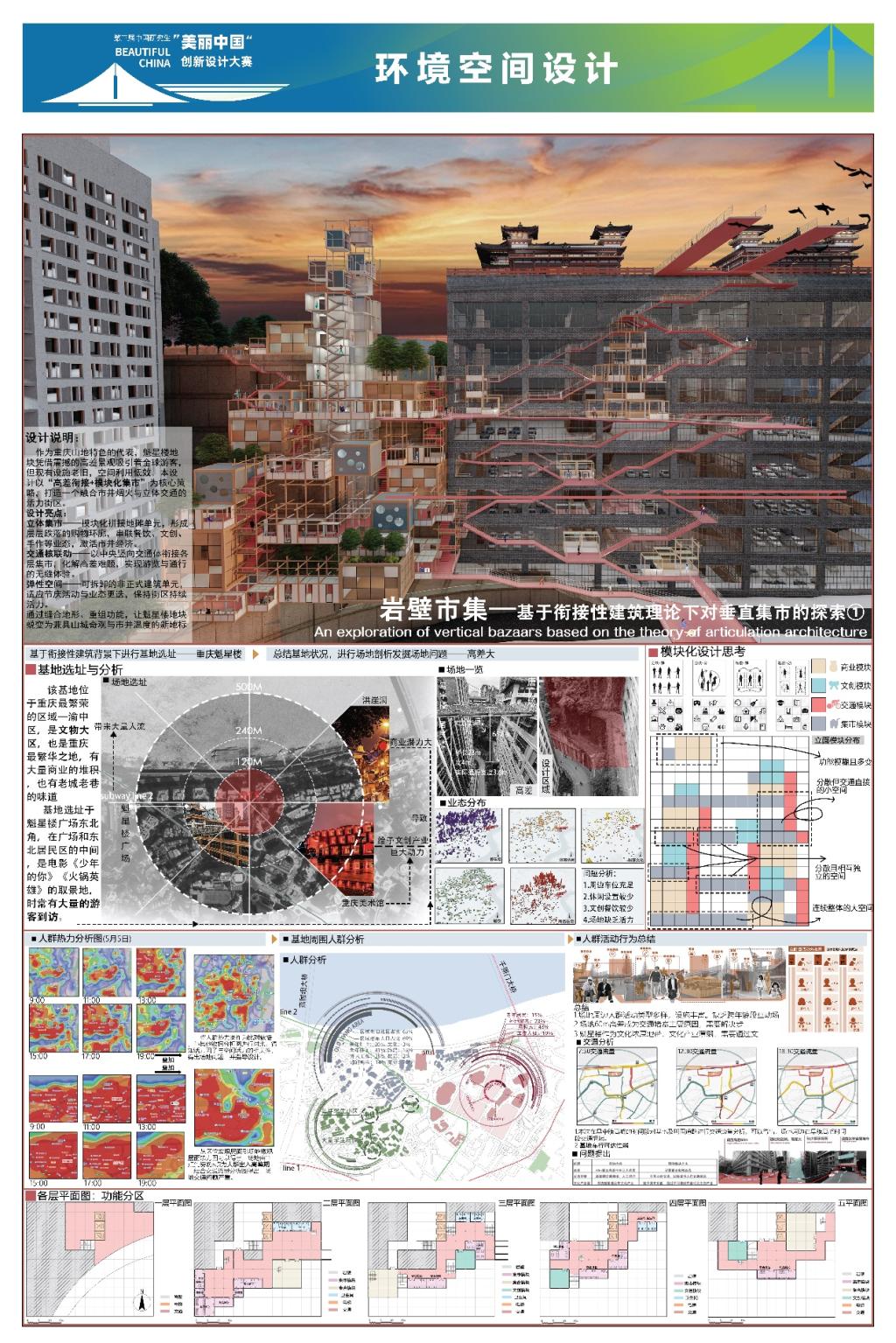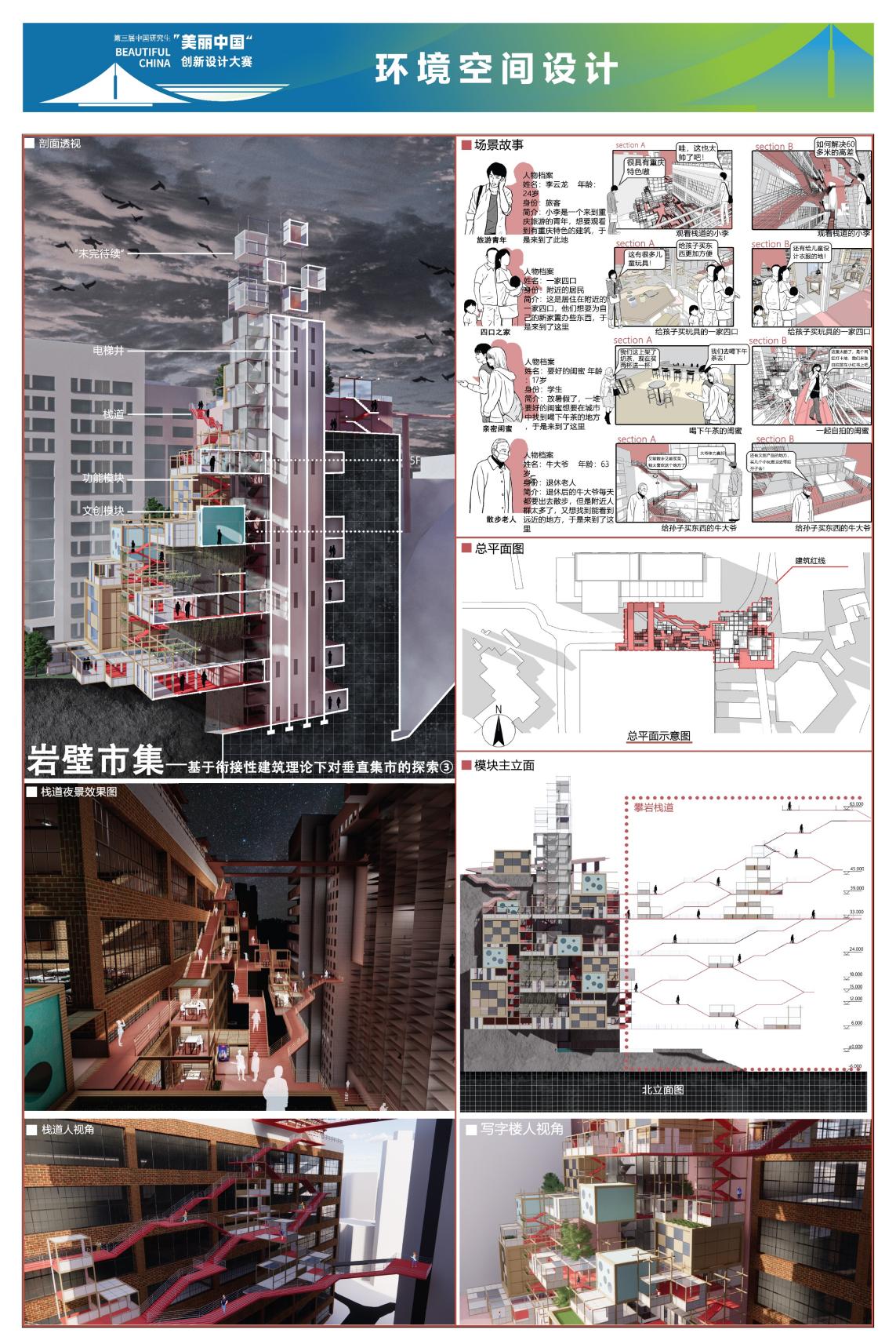 《岩壁集市》项目直面重庆魁星楼地块65米极致高差所带来的空间挑战,巧妙利用毗邻文运旧址的崖壁空间,以“垂直集市”为核心概念,构建了一个集交通连接、商业活力与公共文化于一体的模块化立体廊道。方案通过植入灵活多变的单元模块,不仅有效缝合了被割裂的停车场、写字楼与魁星楼广场,更将原本消极的崖壁转化为激发地域活力的城市客厅。该项目是“美丽中国”愿景下山地城市集约更新与文脉可持续发展的生动实践,为高密度城市中如何平衡遗产保护、生态友好与人文关怀提供了可复制、可推广的创新路径。