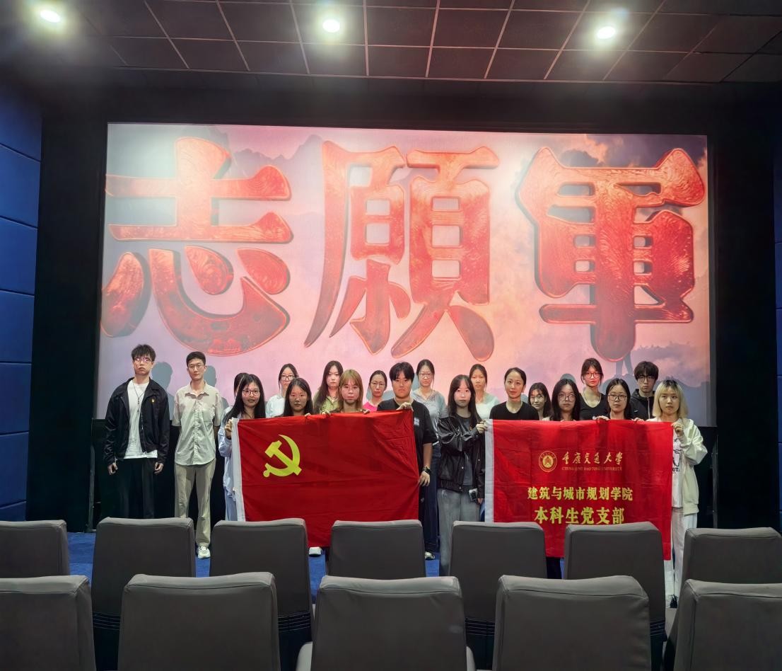 2025年10月17日下午,建筑与城市规划学院本科生党支部在重庆市南岸区华夏影城开展以“厚植爱国情怀・传承红色基因”为主题的10月主题党日活动。活动通过集体观看红色经典影片《志愿军:浴血和平》,引导党员和入党积极分子感悟革命精神、不忘初心使命、汲取奋进力量,增强党支部凝聚力与战斗力。